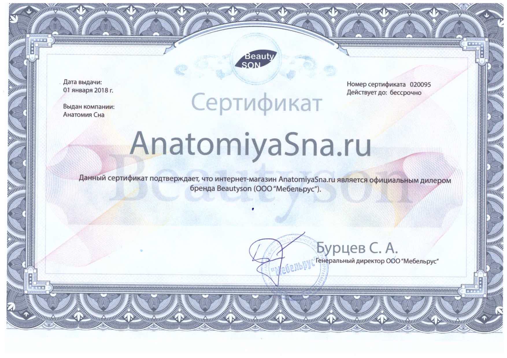 «Анатомия сна» – европейское качество, доступное сегодня каждому! На протяжении 9 лет мы обслуживаем покупателей по всей России. За этот период мы смогли завоевать доверие на отечественном рынке. Многолетний опыт, слаженная работа команды компании, безупречная репутация, множество положительных отзывов от новых и постоянных клиентов, позволяют нам сегодня предложить покупателям наилучшие условия обслуживания, включая разумные цены и развитую логистику. Также мы открыты для сотрудничества с оптовыми заказчиками и производителями.